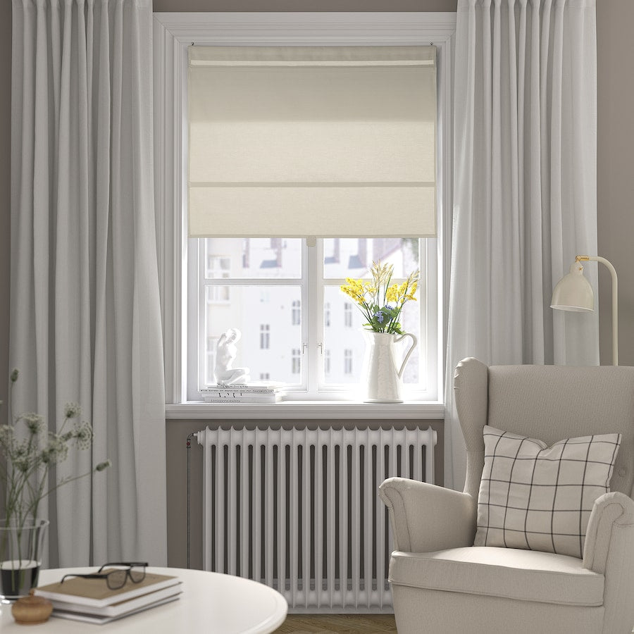 ستارة رومانية RINGBLOMMA بلون بيج، بمظهر كتان أنيق. يقوم القماش بتصفية الضوء ويخلق جوًا دافئًا في الغرفة. قابلة للغسل ومثالية في أي مكان - حتى في المطبخ والحمام. يمكنك التقاطه وإنزاله بمساعدة المغناطيس: