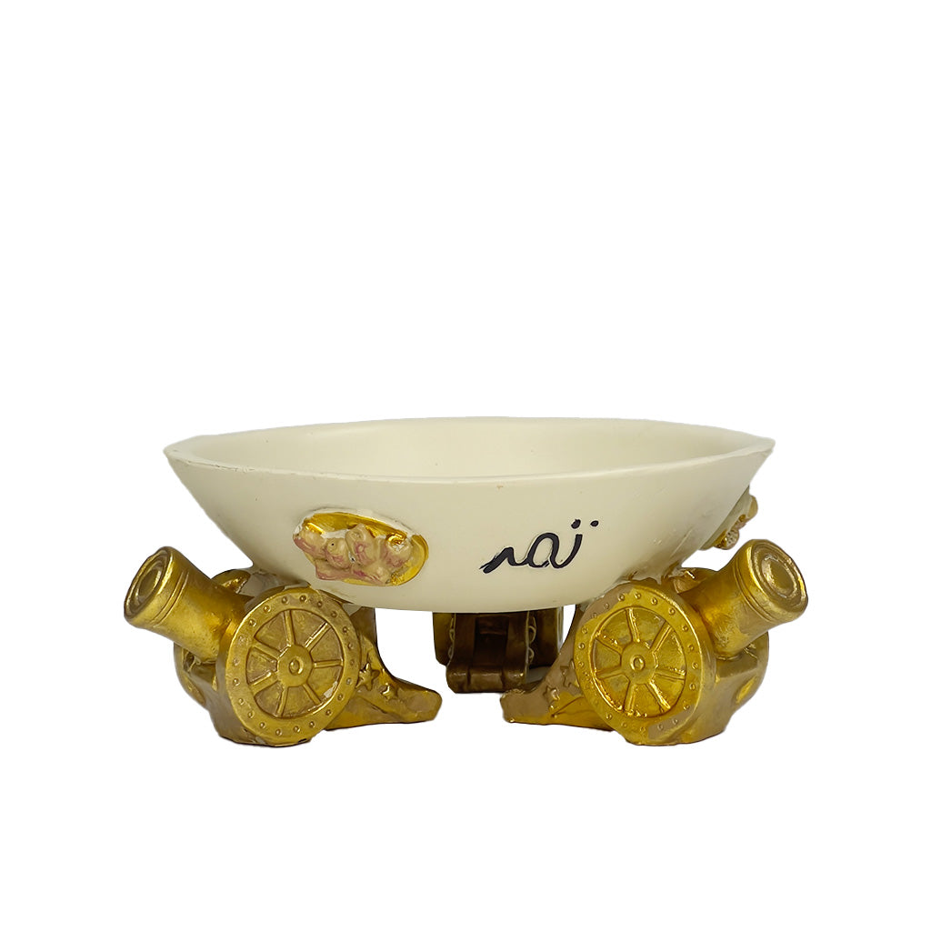 صحن تقديم رمضاني باللون الأبيض بتصميم مدفع بلمسات ذهبية أنيقة ، مثالي لتقديم التمور والحلويات.