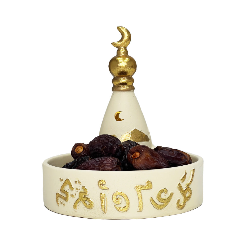 صحن تقديم رمضاني بتصميم هلال مضيء باللون الأبيض، مثالي لتقديم التمور والحلويات بلمسة جميلة وأنيقة.