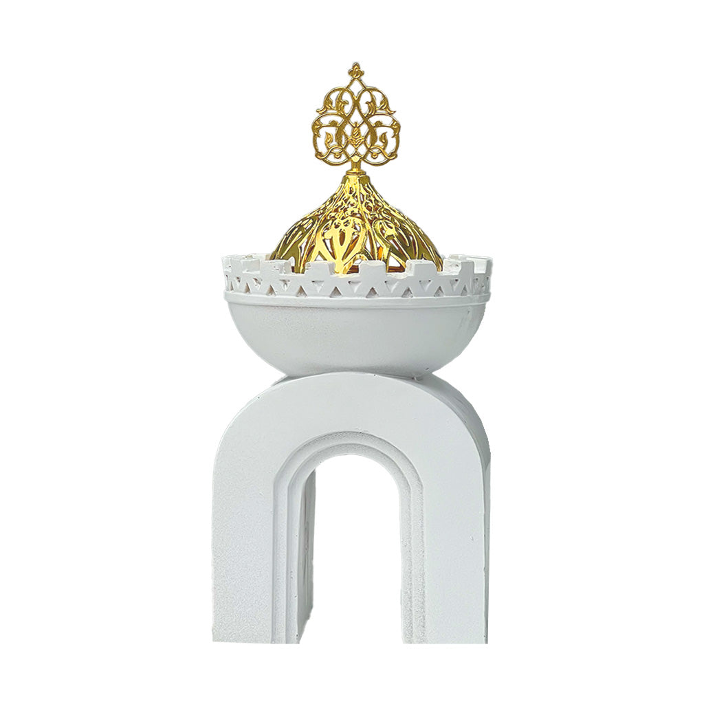 مبخرة أنيقة باللون الأبيض مع غطاء ذهبي، مناسبة لتعطير المنزل بلمسة فاخرة.