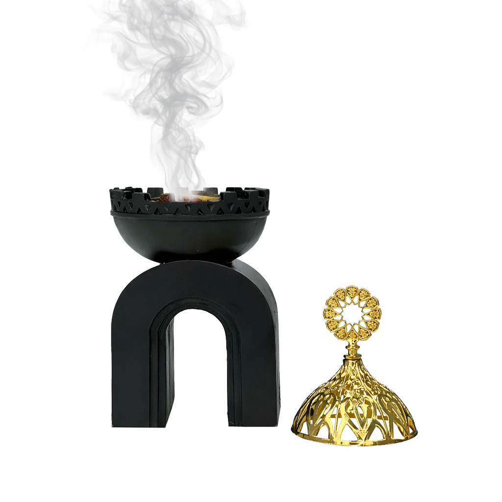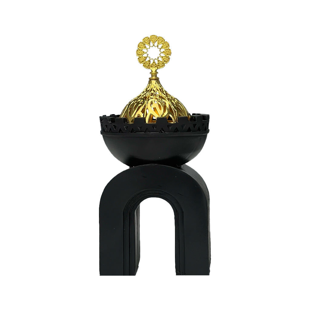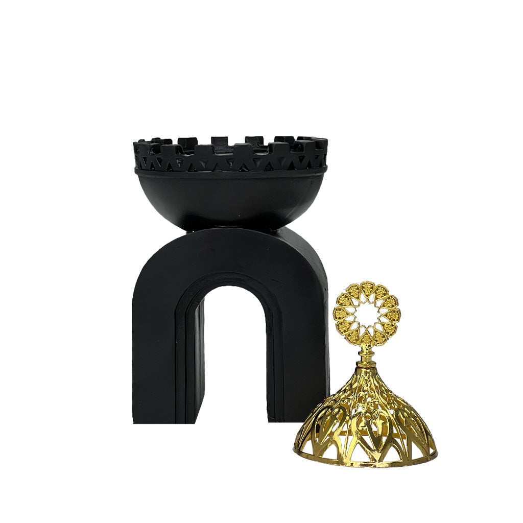 مبخرة أنيقة باللون الأسود مع غطاء ذهبي، مناسبة لتعطير المنزل بلمسة فاخرة.