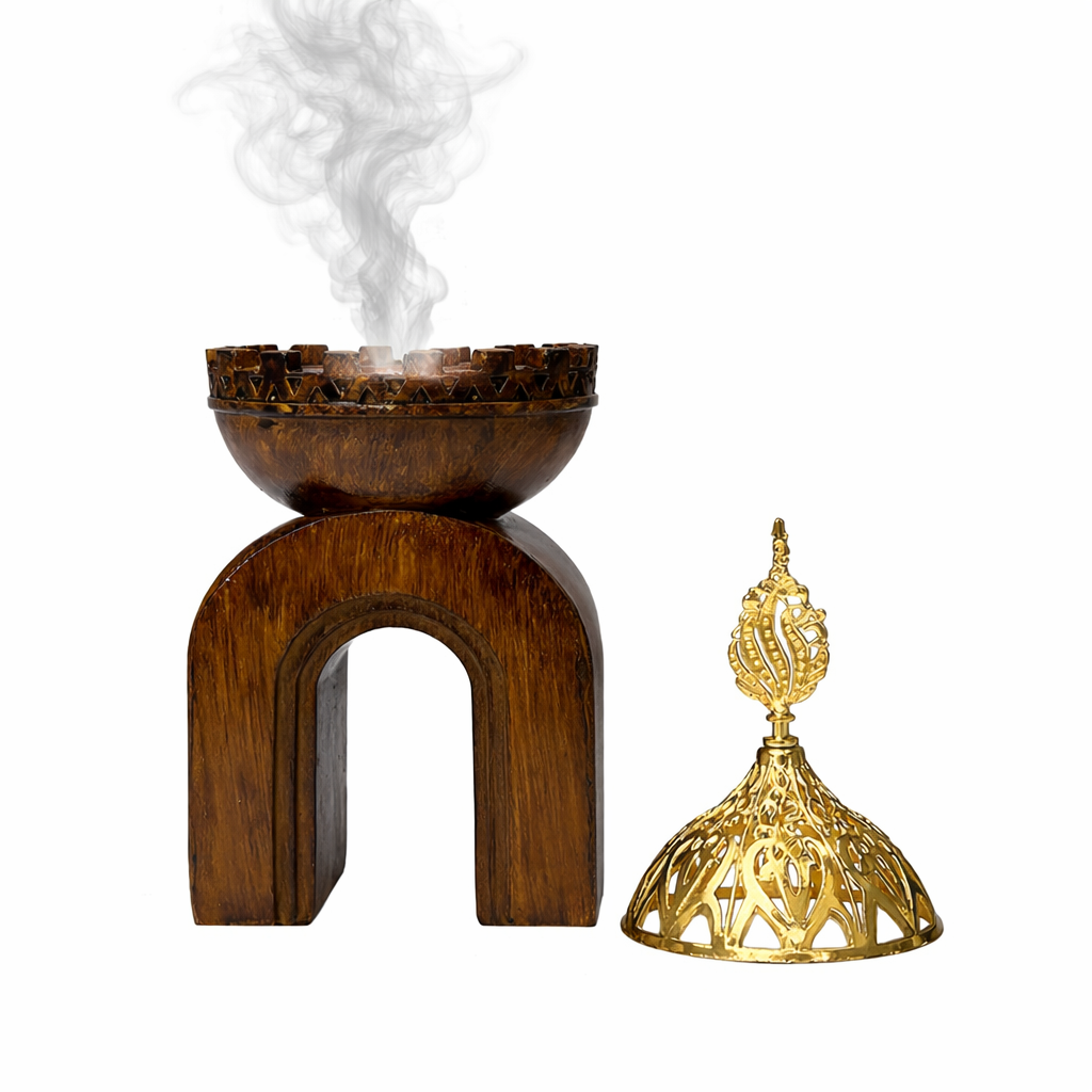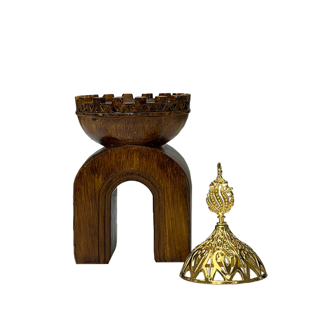 مبخرة أنيقة بغطاء ذهبي وقاعدة خشبية، تضيف لمسة فخامة ودِفء لتعطير المنزل في جميع الأوقات.