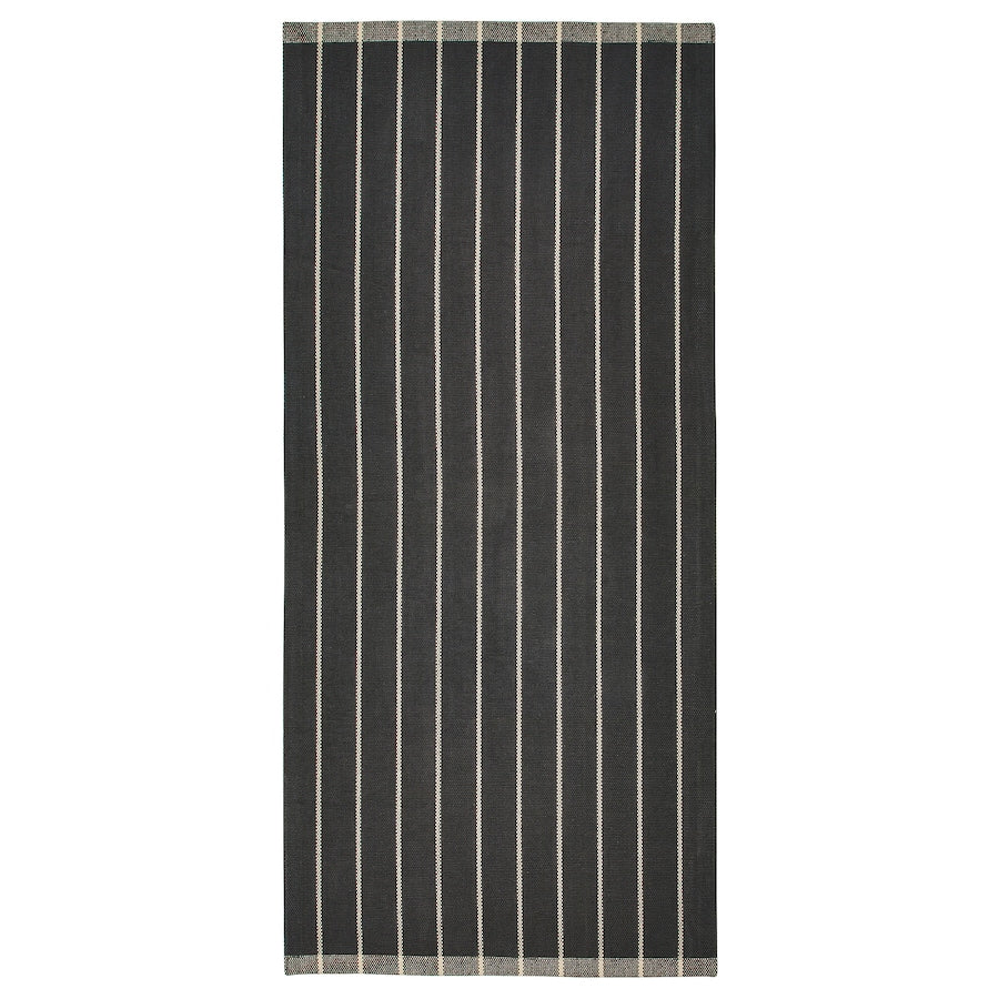 سجادة قطنية ناعمة الملمس باللون الرمادي مع نمط مخطط. مثالي لغرف المعيشة وغرف الطعام، حيث أن النسيج المسطح يجعل من السهل سحب الكراسي واستخدام المكنسة الكهربائية